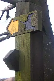 Guides to the route typically divide the walk into 4-8 sections,[1][5][6][7][8][9][10][11][12][13] although as a challenge it can be walked in a single day.[14] Since there are many points at which the path crosses the routes of buses serving Nelson or Colne bus stations, consecutive sections of the walk can easily by accessed by public transport. There are cafes or pubs serving food on most sections of the path. In addition to a guidebook,[1] and the section guides[4] issued by the borough of Pendle, the walk is mapped in the Ordnance Survey 1:25000 map of the South Pennines.[15] The route is waymarked with wooden chevrons bearing a distinctive logo of a black silhouette of a witch (with a pointy hat and riding a broomstick) on a yellow background, and by carved stones on Pendle Hill.