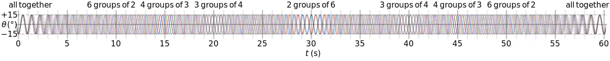 The lengths of the pendulums are set such that in a given time t, the first pendulum completes n oscillations, and each subsequent one completes one more oscillation than the previous. As all pendulums are started together, their relative phases change continuously, but after time t, they come back in sync and the sequence repeats.[1] For small perturbations, the period of a pendulum is given by where L is the length of the pendulum and g is the standard acceleration due to gravity.[6] As t/n is the period of a pendulum completing n oscillations in t, A common choice of t is 60 seconds. Thus, for g ≈ 9.8 ms−2, |