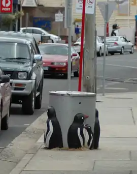 The Big Penguin, which Penguin is home to, was made of ferro cement by the Goliath Cement Co of Railton and later coated with fibreglass, is located in the town’s centre opposite the Post Office. Unveiled on 25 October 1975, it was erected to commemorate the centenary of the naming of the town.[17] Concerns were raised in 2008 as to the possibility of asbestos contamination, but the Big Penguin was given the all clear.[18] It is also interesting to note that all street rubbish bins are decorated with ornamental cement fairy penguins.