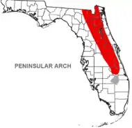 The Peninsular Arch parallels the Ocala Platform to its west and is the dominant sub-surface feature within Florida. It is a structurally high area which affected deposition of sediments during the Cretaceous to the early Cenozoic. It was a high topographic feature during most of the Cretaceous but was covered with Late Cretaceous sediments and became an ideal base and settling point for carbonate sediments during the Eocene when that portion of land was submerged.[1] According to Williams and T. M. Scott, the arch did not affect sediments from depositing during the Neogene through Holocene.[2][3]