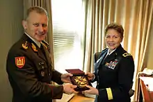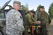The Pennsylvania-Lithuania National Guard Partnership is one of 25 European partnerships that make-up the U.S. European Command State Partnership Program and one of 88 worldwide partnerships that make-up the National Guard State Partnership Program.[2] The Partnership was established on April 27, 1993. In the 20 years that have followed, Pennsylvania and Lithuania have conducted more than 500 exchanges that cover diverse topics such as Senior Leader Engagements, Recruiting, NCO Professional Development, Military Decision Making Process and Strategic Planning, Range Development, Airfield Development and Standards, Defense Support to Civil Authorities, Family Programs, and Resiliency. Also, Pennsylvania and Lithuania have jointly deployed to Afghanistan in support of ISAF, including four rotations of a Police Operational Mentor and Liaison Team. Pennsylvania also provided nine rotations of a team of Logistics Advisors to the Lithuanian led Provincial Reconstruction Team in the Gowhr Province. Pennsylvania and Lithuania are looking at other opportunities to jointly deploy to further expand the relationship between their militaries.