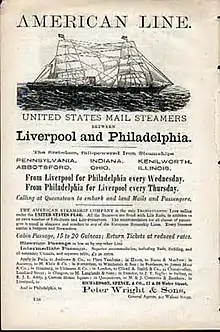 The Pennsylvania class was a class of four cargo-passenger liners built by the Philadelphian shipbuilder William Cramp & Sons in 1872–73. Intended for the newly established American Line, the four ships—Pennsylvania, Ohio, Indiana and Illinois—were at the time the largest iron ships yet built in the United States,[2][3] and were launched with considerable fanfare. Upon entering service in 1874, they became the first American-built steamships to challenge British dominance of the transatlantic trade since the American Civil War.