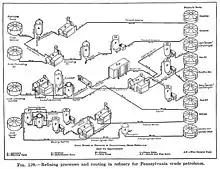 Pennsylvania grade crude oil can be broken down into gasoline, kerosene, fuel oil, gas oil, wax distillate, cylinder stock (or bottoms) and other refined products such as white oil and paraffin. Pennsylvania grade crude oil when seen in reflected sunlight has a green color and under ultraviolet light looks fluorescent.