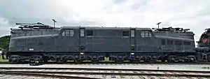 The frames, running gear and riveted body for the prototype GG1 were built by Baldwin Locomotive Works. The partially built locomotive was then shipped to the General Electric factory in Erie, Pennsylvania for the installation of its electrical components.[4] Twelve traction motors, two on each of the GG1's six powered axles, produced 4,620 horsepower (3,450 kW) that was transmitted to the 57-inch (1,400 mm) driving wheels by a quill drive.[5] Unlike other GG1s, access steps were installed at each end of the locomotive to ease maintenance of the pantographs; the pantographs were mechanically linked to a safety plate that blocked access to the steps when the pantographs were raised.[4] The finished locomotive was 79 feet 6 inches (24.23 m) long and 16 feet (4.88 m) tall, with both of its pantographs lowered.[1]