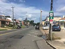 After passing the naval facility, Oxford Avenue continues northeast at the intersection with Robbins Street/Martins Mill Road and crosses Levick Street.[5] PA 232 runs north through the residential Lawncrest neighborhood and reaches the Five Points intersection with PA 73 (Cottman Avenue) and Rising Sun Avenue in the Burholme neighborhood. From this junction, the route passes a mix of urban residential and commercial establishments as it comes to a bridge over CSX's Trenton Subdivision railroad line at the Bleigh Avenue intersection and reaches a junction with Verree Road. PA 232 continues into the Fox Chase neighborhood, crossing SEPTA's Fox Chase Line at-grade south of its terminus at the Fox Chase station.[4][5] The route heads into the downtown area of Fox Chase and passes east of SEPTA's Fox Chase Bus Loop before coming to the Rhawn Street intersection, where the road makes a turn to the northwest.[4][5]