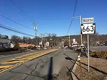PA 663 was once part of the Steinsburg and Milford Square Turnpike. The turnpike was chartered in March 1858.[6] When Pennsylvania legislated routes in 1911, what is now PA 663 was not given a number.[7] PA 663 was designated in 1930 to run from in U.S. Route 422 (US 422, High Street) in Pottstown north to PA 73 in New Hanover Township. At this time, the entire length of the route was paved, along with the unnumbered road between PA 73 and Quakertown.[2] In 1936, PA 663 was extended north to an intersection with US 309 (now PA 309) and PA 212 (now PA 313) in Quakertown. The route followed its current alignment between PA 73 and Pennsburg before it followed Quakertown Road and Sleepy Hollow Road to Spinnerstown, where it turned east and followed Spinnerstown Road and Milford Square Pike to Quakertown.[8] By 1967, the southern terminus of PA 663 was rerouted to PA 100 in Pottstown, heading west on King Street.[9] In the 1960s, PA 663 was shifted from Milford Square Pike to a new alignment to the north between the Pennsylvania Turnpike Northeast Extension and Quakertown.[10] After construction began in 1973, a new alignment of PA 663 to the south from Pennsburg to the Pennsylvania Turnpike Northeast Extension opened a year later, with the route moved off Quakertown Road, Sleepy Hollow Road, and Spinnerstown Road.[11][12]