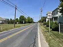 The portion of PA 772 east of Rothsville follows the Newport Road, a colonial road that connected Mount Hope, Pennsylvania to Newport, Delaware and was used to send wheat from Lancaster County to Delaware.[6] When routes were first legislated in Pennsylvania in 1911, current PA 772 was not given a route number.[7] In 1926, the road between Leacock and Brownstown became a portion of US 222.[8] PA 41 was designated concurrent with this section of US 222 in 1927 before being replaced with PA 240 a year later.[9][10] In 1928, Fruitville Pike heading south from Manheim became PA 672.[10]