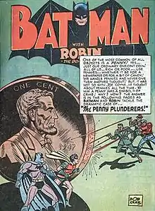 The Penny Plunderer (Joe Coyne) is a fictional criminal in the DC Universe, and an adversary of Batman. He first appeared in World's Finest Comics #30 (September–October 1947).[1][2] The story was written by uncredited Bill Finger; the art was credited to Bob Kane.[3]