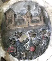 Between 1624 and 1627[2] Richard Beaple (1564-1643) and the four other co-executors of the will of his son-in-law John Penrose, Mayor of Barnstaple in 1620, built the large structure in Litchdon Street, Barnstaple, known today as Penrose's Almshouses. It consists of a cobbled courtyard around which are twenty almshouses, for forty poor residents, with chapel and board room and vegetable gardens behind. A small coloured relief-sculpted depiction of these almshouses with a group of four poor inmates (with a woman, perhaps a wife, behind), within a roundel survives on the right side of Richard Beaple's monument in St Peter's Church, to match one on the left side depicting a merchant pointing to a treasure chest with three sailing ships on the sea behind.