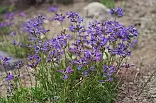The glandular inflorescence is made up of 1 to 6 separate clusters of dark purple-blue tubular flowers each just over a centimeter long. The outer surface of the flower generally has glandular hairs, and on the inside there are hairs on the floor of the flower mouth and on the staminode.