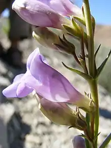 There are four varieties of this species, including var. albifluvis (White River beardtongue), var. cyanomontanus (Neese's Blue Mountain beardtongue), and var. garrettii (Garrett's beardtongue).[2] The var. albifluvis is a rare variety limited to northeastern Utah and northwestern Colorado. It is up to 30 centimeters tall and produces lavender or light blue flowers.[3] The flowers are pollinated by bees.[4] This variety is a candidate for federal protection because it grows on oil shale, a common source of petroleum.[5]