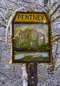 ![]() Pentney village sign in the midst of a rare springtime snowfall during 2008 | |