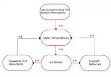 Much like the last glacial period, the penultimate glacial period was caused by a great orbital eccentricity of Earth.[5] This eccentricity causes greater seasonal impacts than normal because it limits the amount of sunlight that reaches the earth's surface, lowering the temperature.[6] Due to this, northern insolation (the amount of sunlight that reaches the surface) is reduced, this means when it's summer, less heat is exposed to the snows of the winter, which don't completely melt.[2] This buildup of ice and snow over thousands of years eventually leads to residual ice sheets, which would also reflect light away from the earth, further cooling the earth.[7] A decrease in greenhouse gas concentrations such as CO2, are a result of the expanded ice sheets.[5] This is because as the Earth cooled, and ice sheets expanded, the ocean waters became colder, which then could absorb more CO2 from the atmosphere.[8] These factors all feedback into each other: as the ice sheets extended, more CO2 was absorbed, and more light was reflected off the ice sheets, furthermore expanding the ice sheets, this self-reinforcing cooling setting the world into a glacial period.[8]