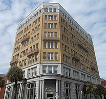 Many saw it as a sign of progress while others were afraid it would ruin Charleston's skyline. President William Howard Taft, who viewed the city from the top of the building, said, "I don't believe that it did ruin the skyline, but if it did the view from up here makes it worth it." When the building opened in April 1911, people came just to ride the steel frame elevators.[12] The first two floors of the building are faced with Winnsboro granite, while the upper floors are faced with buff-colored brick and terra cotta. The eight-story building is constructed of concrete and steel and rated as fireproof. Originally it had, in addition to the banking space, nine rooms on a mezzanine and thirteen rooms on each of the upper floors, and the building was steam heated.[13] The People's Bank closed in 1936 and the building was purchased by the Southeastern Securities Co., Charles L. Mullaly, president.