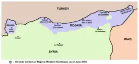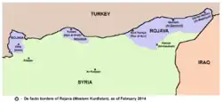 While many rebel groups clashed with the YPG, jihadist and Salafist groups did so the most often.[32] The YPG proved to be the only Kurdish militia able to effectively resist the fundamentalists.[33] While the YPG protected the Kurdish communities it was able to extract a price: it prevented the emergence of new, rival militias and forced existing ones to cooperate with or join the YPG forces on its terms.[34] This was how the Islamist attacks enabled the YPG to unite the Syrian Kurds under its banner[35] and caused[36] it to become the de facto army of the Syrian Kurds.[37][38][39][40]