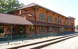 The Rock Island Depot and Freight House is a two-story railroad station and adjacent one-story freight house from the turn of the 20th century. It was constructed in 1899 directly besides the Illinois River in the American city of Peoria, Illinois. The depot and freight house are Peoria's last remaining historic reminders of the importance of railroading in the city's past.[1] The depot was built by the Chicago, Rock Island and Pacific Railroad as the terminus of a major branch line that delivered significant goods and passengers to Peoria. The 1900 opening of the depot was attended by "throngs of populous;" at its height before the depression of the 1880s, Peoria was a transportation hub.[1] The station's clock tower was removed in 1939.[3] The buildings were listed on the U.S. National Register of Historic Places in 1978.[2] The last Rock Island train out of the station was the Peoria Rocket in 1978, of the company's Rock Island Rockets series.