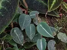 Peperomia eburnea is a species of plant in the genus Peperomia native to Colombia and Ecuador.[1] It has a creeping or trailing growth habit, and grows in wet tropical biomes. Its foliage is green, and often has a single white stripe, along with red spotted backs of the leaves.[2] Sodiro, who collected the type specimen for this species, described the red-mottled variant as maculata,[3] but this variety is not scientifically accepted.