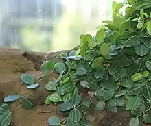 Peperomia quadrangularis is a small herby plant, often found growing on top of trees or rocks. The latin name points to the stems which are quadrangular, one to two millimetre thick, and feature tiny hairs. Leaves are elliptic, obovate, or orbicular, 10 to 22 mm wide and 12 to 30 mm long, with obtuse or only slightly pointed apex. The leaves grow typically opposite, although adventitious roots can sometimes take the place of a leaf.[3]