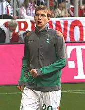 In August 2006, Mertesacker moved to Werder Bremen in a €5 million transfer deal after a highly impressive performance in the 2006 World Cup, in which Germany finished third.[37] At the time of his transfer, he and Brazilian midfielder Diego, who joined from Porto, were jointly Bremen's most expensive signings in the club's history.[38] Despite missing the first month and a half through an injury sustained at the World Cup, he quickly made the centre-back position his own upon his return to the starting eleven. In November, he scored his debut Champions League goal in a 1–0 win over Chelsea to end the Premier League winners' unbeaten streak in the season's competition. Upon his first return to the AWD-Arena for the first game of the second half of the season, he refused to celebrate after scoring against his boyhood club.[39]