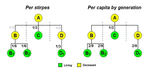 Per stirpes (/pɜːr ˈstɜːrpiːz/; "by roots" or "by stock")[1] is a legal term from Latin, used in the law of inheritance and estates. An estate of a decedent is distributed per stirpes if each branch of the family is to receive an equal share of an estate. When a heir in the first generation of a branch predeceased the decedent, the share that would have been given to that heir would be distributed among that heir's issue in equal shares. It may also be known as strict per stirpes[2] or the old English approach,[3] and differs from distribution per capita, as members of the same generation may inherit different amounts.[4] In section 33 of the Wills Act 1837 in England and Wales, it is called according to their stock.[5]
