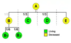 Example 1A: The testator A, specifies in his will that his estate is to be divided among his descendants in equal shares per stirpes. A has three children, B, C, and D. B is already dead, but has left two children (grandchildren of A), B1 and B2. When A's will is executed, under a distribution per stirpes, C and D each receive one-third of the estate, and B1 and B2 each receive one-sixth. B1 and B2 constitute one "branch" of the family, and collectively receive a share equal to the shares received by C and D as branches (figure 1).