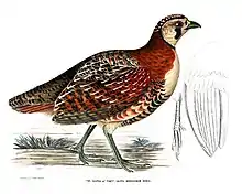 The scientific name of Sacfa hodgsoniae was given by Brian Houghton Hodgson to commemorate his first wife, Anne Scott.[4] The original genus proposed by Hodgson was based on the Tibetan name for it, Sakpha.[5] There are 16 tail feathers while most other Perdix species have 18. Neither males nor females have spurs on their legs.[6] Phylogenetic studies place the species as basal within the genus.[7]