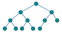 • A complete binary tree is a binary tree in which every level, except possibly the last, is completely filled, and all nodes in the last level are as far left as possible. It can have between 1 and 2h nodes at the last level h.[19] A perfect tree is therefore always complete but a complete tree is not necessarily perfect. An alternative definition is a perfect tree whose rightmost leaves (perhaps all) have been removed. Some authors use the term complete to refer instead to a perfect binary tree as defined above, in which case they call this type of tree (with a possibly not filled last level) an almost complete binary tree or nearly complete binary tree.[20][21] A complete binary tree can be efficiently represented using an array.[19]