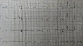 | An ECG showing pericarditis, with ST elevation in multiple leads and slight reciprocal ST depression in aVR. | |