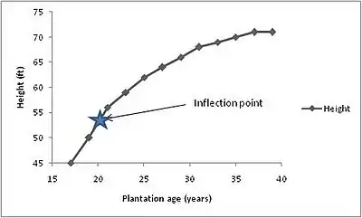 In forestry, periodic annual increment (PAI) is the change in the size of a tree between the beginning and ending of a growth period, divided by the number of years that was designated as the growing period.[1] For sigmoid growth, the graph of PAI increases rapidly and then quickly declines, approaching zero. PAI may go negative if a tree loses volume due to damage or disease. Periodic annual increment is commonly used instead of current annual increment as a basis for computing growth per cent. Growth per cent indicates the rate of increase with relation to the wood capital required for its production, this is usually based on a single year's growth.[2]