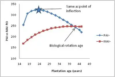 When mean annual increment (MAI) and periodic annual increment (PAI) are graphed together, the point in which they intersect is called the biological rotation age. The biological rotation age is the age in which a stand should be harvested to maximize long-term yield.
