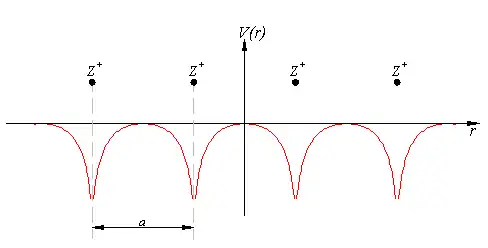 When talking about solid materials, the discussion is mainly around crystals – periodic lattices. Here we will discuss a 1D lattice of positive ions. Assuming the spacing between two ions is a, the potential in the lattice will look something like this: