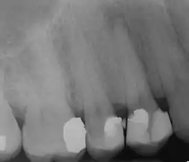Radiograph showing bone loss between the two roots of a tooth (black region). The spongy bone has receded due to infection under tooth, reducing the bony support for the tooth.