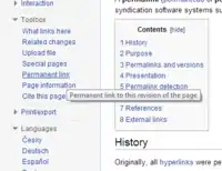On Wikipedia, a permanent link to a specific version of an article is obtained from the "Permanent link" entry in the toolbox.