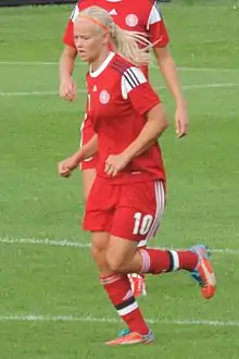 In 2017, she was named in national coach Nils Nielsen's Denmark squad for the Euro 2017. She captained the team to the final and scored a goal in Denmark's 4–2 defeat by hosts the Netherlands. She was voted runner-up to Lieke Martens in the UEFA Women's Player of the Year Award for 2016–17.[25] On 16 September 2021, she broke Merete Pedersen's 12.5-year-long national record, becoming the record goalscorer of the Denmark national team, with her 66 goal in her 129 games.[26] In the successful qualifying for the Euro 2022 she was used in all ten games and scored eight goals. She was called up for the Euro 2022 and scored the only goal for Denmark, but was eliminated with the national team in the group stage.