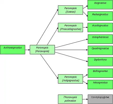 Peronopsis palmadon is intermediate between Peronopsidae and Condylopygidae, but it is not clear whether P. palmadon is ancestral to the Condylopigidae, a condylopigid exhibiting regression towards ancestral characters, or an example of parallel evolution.[1]