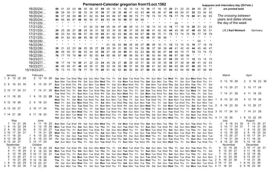 | # | Julian centuries (mod 7) | Gregorian centuries (mod 4) | Dates | 01 08 15 22 29 | 02 09 16 23 30 | 03 10 17 24 31 | 04 11 18 25 | 05 12 19 26 | 06 13 20 27 | 07 14 21 28 |