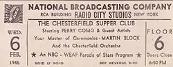 The Chesterfield Supper Club had a main theme song, "Smoke Dreams", composed by John Klenner, Lloyd Shaffer and Ted Steele. Another musical theme that was also used on the broadcasts was Roy Ringwald's "A Cigarette, Sweet Music and You".[28] These themes were also used when the Chesterfield Supper Club television shows began in 1948.[3] Como was joined by Jo Stafford in 1946, with Perry hosting the 15 minute program on Monday, Wednesday and Friday evenings. By 1948, Peggy Lee and the Fontane Sisters had joined the cast, with the Fontane Sisters moving to television with Como.[29][26][30][31] The radio show continued and was simulcast after the "Supper Club" television broadcasts began; Como was heard on radio until he left NBC in 1950 for CBS with The Perry Como Chesterfield Show.[3] Mutual began simulcasting his CBS television show on radio in 1953; it was the first instance of a simulcast between two different networks.[10] The radio show continued until June 1955, when Como left CBS to return to NBC.[10][32][33] [34][35][36]