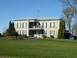 The three finished facades have bracketed eaves extending around them, and plain eaves on the north facade. The building's fenestration consists of six-over-six double-hung sash windows in rectangular openings with heavy lintels. A long wood and stone wing extends to the north. In the 1950s, the building's interior was totally remodeled and minor alterations were made to the exterior, including changes to the front porch and the addition of wood shutters.[2] The original design had an outdoor staircase leading to the second floor of the house above the current front porch.[3]