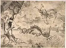 An engraving by the Venetian Ferrando Bertelli probably dates to the 1550s and is a close rendering, though extending the composition on all sides except the left, possibly reflecting the original size of the painting, which has been cut down to an unknown extent. Giovanni Battista Fontana (1524–1587) produced two prints, one dated 1564 and not very similar, the other closer to the Titian and undated. Neither are exactly reproductions.[25] Illustrations to Ovid from the late 16th century on often adopt aspects, or the general layout of the painting, without being copies. The many paintings of the subject in later centuries tended to follow Titian's reduction of the subject to the two main figures and the monster, although not copying his composition. The subject became especially popular in the 19th century.