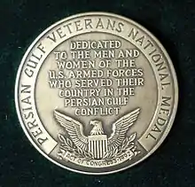 The Persian Gulf Veterans National Medal is an honorific military medal authorized by United States Congress presented to members of the U.S. Armed Forces who served in a combat zone during the Persian Gulf War.[1][2][3]