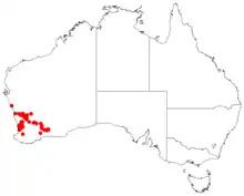 This persoonia grows in heath mallee and woodland between Eneabba, Perth Frank Hann National Park and Maya in the south-west of Western Australia.[2][4]