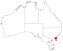 Mountain geebung occurs in montane heath and wet forest in south-eastern New South Wales south of the Sandhills Range including the Tinderry Range, the Kybean Range and Mount Kydra.[3] A small disjunct population occurs in the Moroka River catchment in Victoria. These have smaller leaves that are 3–8 mm (0.1–0.3 in) long and 1–2 mm (0.04–0.08 in) wide. It is thought that this population may constitute a separate taxon.[7]