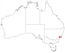 Bargo geebung is found in small scattered patches in an area bordered by Picton and Douglas Park to the north, Yanderra to the south, Cataract River to the east and Thirlmere to the west[1] where it grows on Sydney sandstone and Wianamatta shale soils, 100–300 m (330–980 ft) above sea level.[3] It grows in dry sclerophyll eucalypt forest, under forest red gum (Eucalyptus tereticornis) and broad-leaved red ironbark (E. fibrosa) with a grassy understory of kangaroo grass (Themeda triandra), or more open woodland with such trees as red bloodwood (Corymbia gummifera), scribbly gum (Eucalyptus sclerophylla), grey gum (E. punctata), narrow-leaved stringybark (E. sparsifolia) and small-leaved apple (Angophora bakeri) with a shrubby understory of plants such as wreath bush-pea (Pultenaea tuberculata).[9] The increased light and lack of competing plants means the species adapts preferably to growing on road verges.[1]