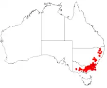 The dwarf geebung grows in woodland and forest along the tablelands south from the New England district in New South Wales to Victoria where it is widely distributed and locally common in montane and subalpine areas.[2][4]