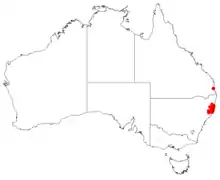 This geebung grows in forest on the coastal ranges in the Coffs Harbour district and south to the Manning River in eastern New South Wales.[4]