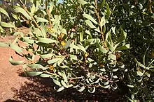 Persoonia cordifolia is an erect to spreading shrub that typically grows to a height of 0.3–2 m (1 ft 0 in – 6 ft 7 in) with several to many stems arising from the base and has smooth, mottled grey bark. The branches and leaves are hairy at first but become glabrous with age. The leaves are arranged alternately, spatula-shaped or elliptic to linear, 20–65 mm (0.79–2.56 in) long, 3–13 mm (0.12–0.51 in) wide and twisted through up to 90° so that the leaves are held in the vertical plane. Some populations, such as plants near Yellowdine, have more twisted leaves than others. The flowers are arranged in groups of up to ten along a rachis up to 70 mm (2.8 in) long that usually grows into a leafy shoot after flowering, each flower on a pedicel 2.5–9 mm (0.098–0.354 in) long. The tepals are bright yellow, 6.5–11.5 mm (0.26–0.45 in) long with bright yellow anthers. Flowering occurs from November to February and the fruit is an oval drupe 7–13 mm (0.28–0.51 in) long and 5–7 mm (0.20–0.28 in) wide containing a single seed.[2][3][4][5][6]