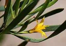 Persoonia quinquenervis is an erect, spreading shrub that typically grows to a height of 0.2–2.5 m (7.9 in – 8 ft 2.4 in) with smooth bark, sometimes rough and peeling near the base and young branchlets that are covered with greyish or whitish hair for the first year or two. The leaves are linear, lance-shaped, narrow oblong or narrow spatula-shaped, and twisted at the base, 20–75 mm (0.79–2.95 in) long and 0.8–10 mm (0.031–0.394 in) wide usually with longitudinal ridges on both surfaces. The flowers are arranged in groups of up to ten along a rachis up to 60 mm (2.4 in) long that continues to grow after flowering, each flower on a pedicel 4–17 mm (0.16–0.67 in) long with a leaf or a scale leaf at the base. The tepals are bright yellow, 7.5–15 mm (0.30–0.59 in) long. Flowering mostly occurs from November to December and the fruit is a smooth oval drupe 8–12 mm (0.31–0.47 in) long and 4–6 mm (0.16–0.24 in) wide.[2][3][4][5]
