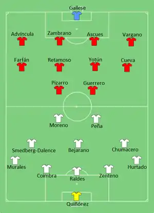In the draw held on February 21, 2016, in New York, the Peruvian team was in Group B along with Haiti, Brazil and Ecuador. The team's debut in the competition took place on June 4, 2016, defeating Haiti 1:0.[47][48] Four days later they drew 2:2 against Ecuador.[49][50] Peru closed its participation in the first phase with a 1:0 victory against Brazil.[51][52] The Peruvian team added seven points which allowed him to occupy the first place in his group and advance to the next phase.[51][53]