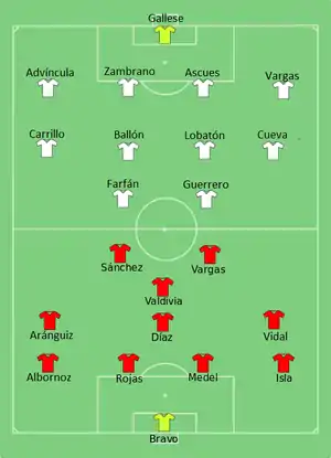 The Peruvian team was one of the 12 participating teams in the 2015 Copa América, a tournament that took place between June 11 and July 4, 2015, in Chile. The Peruvian team played his thirtieth Copa América and the fifteenth consecutive. In the draw held on November 24, 2014, in Viña del Mar, Peru was paired in Group C along with Brazil, Colombia and Venezuela.[30] Peru's debut in the competition occurred on June 14, 2015, losing 2:1 to Brazil.[31][32] Four days later he got his first victory by defeating Venezuela by a score of 1:0.[33][34] Peru closed its participation in the first phase with a goalless draw against Colombia.[35][36] Peru added four points which allowed them to occupy second place in their group and advance to the next phase. In the quarterfinals, they faced the Bolivian team, which they won 3:1 with 3 goals from Paolo Guerrero.[37][38] In the next round they faced the Chilean team, where the locals were victorious 2:1 with two goals from Eduardo Vargas.[39][40] In the match for third place, the Peruvian team faced Paraguay, the match ended with a 2:0 victory, with goals from André Carrillo and Paolo Guerrero.
