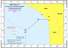 In the case, Peru, whose legal team included jurist Juan Vicente Ugarte del Pino,[1] argued that the maritime boundary has never been defined by a treaty and should run on a southwestern direction from their land border, perpendicular to the natural slope of the South American coast in an equidistant angle from both coastlines. Chile claims that in trilateral treaties signed together with Peru and Ecuador in 1952 and 1954, it is clearly stated that a maritime boundary (written as "límite marítimo" in Spanish) runs in a western direction, parallel to the equator.[2][3] The Chilean agent to the Court is former Undersecretary for Foreign Affairs, Ambassador Alberto van Klaveren. The Peruvian agent is the current Ambassador to The Netherlands, Allan Wagner.